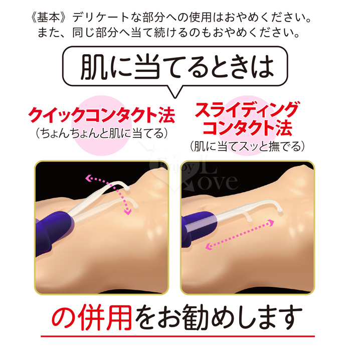 日文簡述: 新体験! 快感と官能のパルスショック! 4種の機能別アタッチメントから放たれる6段階パルスの 刺激的な快感に痺れる! 使用箇所の説明とご注意 ■敏感度の高い部分…舌、乳首、外陰部、つま先など ■中程度の敏感度の高い部分… 首、胴体側面、胸部、腹筋、内腿、足裏 ■敏感度の低い部位…胸部、背中、腕、その他の太もも、臀部 《使ってはいけない部分》 眼球、外耳道、傷口、尿道、肛門など、敏感な部位への接触はおやめください。 また、医療機器(ペースメーカーなど)をご使用の方、妊娠中の方、高血圧、心臓病、 その他の特別な疾患をお持ちの方は、本製品を使用しないでください。 使用中に異常を感じた場合は、直ちに使用を中止してください。 《使い方》 ご使用前に、水性潤滑剤で肌を湿らせるか、ウェットティッシュで肌の表面を時々拭いてください。 (乾燥した肌は抵抗力が高くなるため。) 用意ができたら、クリアスティックを本体に差し込んで、電源スイッチを長押しし、本体をスタンバイ状態にします。、 その後、+と-で、高周波6段階の強弱を調整しながら、パルスの刺激を操作します。 やけどを防ぐため先端を同じ個所に長時間当て続けず、先端をちょんちょんと肌に当てるクイックコンタクト法、 先端を肌にあて、スッと撫でるスライディングコンタクト法の併用をおすすめします。 終了するには再度電源スイッチを長押しし、本体をシャットダウンさせてください。 ※1…この様なパルストイを初めてご使用になる場合は、まず最弱パルスを手の皮膚でテストしてください。 ※2…腕、太もも、お尻など、敏感でない部位は、最小パワーから刺激を始め、じょじょにパルスの強度を調整してください。 《本体の充電》 ■付属の充電ケーブルのピン先を本体底の小穴に差しこみ、もう一方はスマホ充電器やPCなどのUSB口(Type-A)に差し込むと 充電を開始します。充電中は電源スイッチが点滅、満電になると点灯に変わります。 ■充電時間:約90分 ■連続使用時間:約60分 《本体の取り扱いについて》 クリアスティックはガラス製ですので、取り扱いにはご注意ください。 通電中は、感電を防ぐため、通電部周辺に触れないでください。 ご使用の際は、適切なパルスの強度を選択し、怪我をしないようご注意ください。