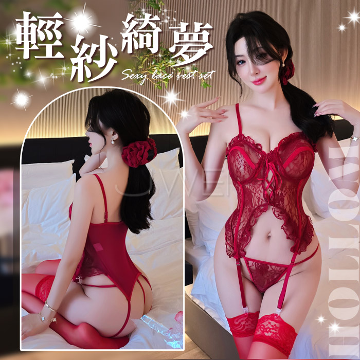 輕紗綺夢.超A蕾絲吊帶半截裹胸性感吊襪帶馬甲-紅色【馬甲(含吊襪帶)+T褲+紅長筒絲襪】