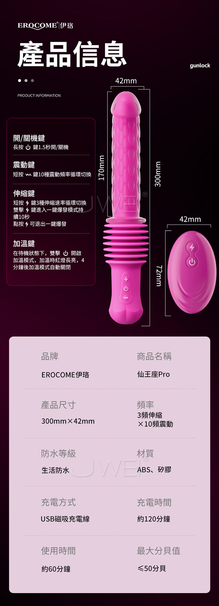 1.仿真頭部,龍鱗紋理 2.3頻伸縮,自動抽送 3.尺寸適中,不撐大私處 4.智能加溫,拒絕冰冷 5.雙層矽膠,放心安全 6.全身防水,玩法多樣 7.搭配吸盤,解放雙手 8.遠程遙控,玩法多樣 產品規格 ■尺寸:大小詳如圖片標示 ■材質:TPE+ABS ■功能:3頻伸縮、10頻震動、、無線遙控、吸盤底座、加溫