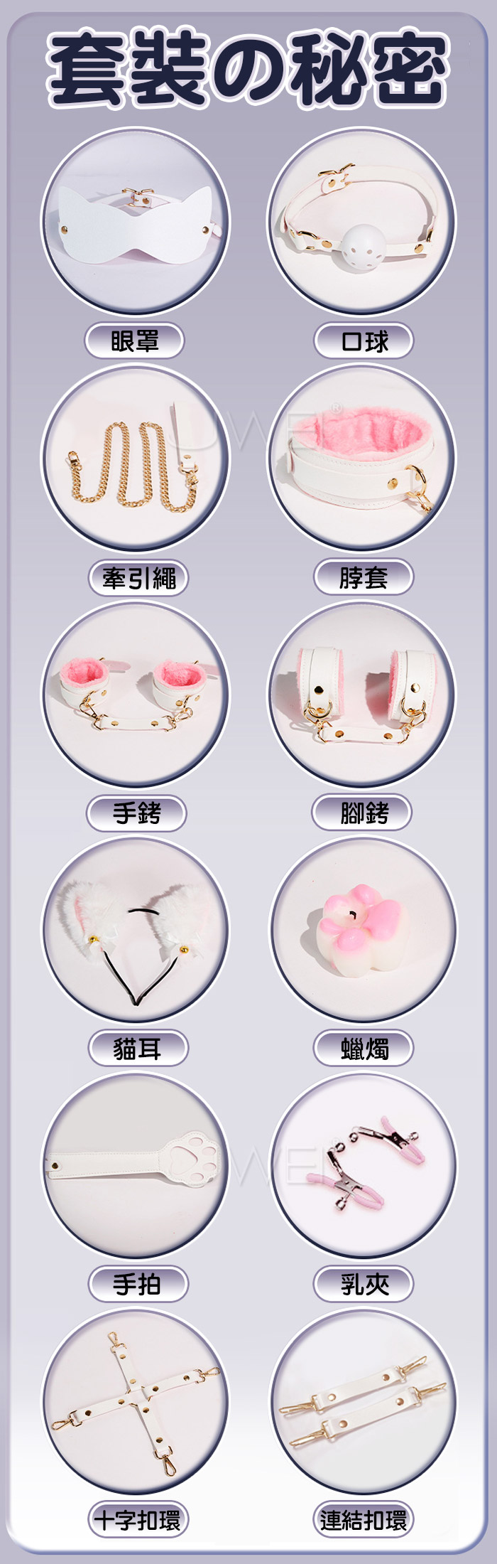 甜系喵語の萌趣束縛 你願意成為我的訓養師嗎? MASTER,帶我回家吧!” 開啟甜蜜與束縛的奇妙之旅! 讓平淡的生活充滿甜蜜與驚喜 打造屬於你的甜蜜小世界! 產品規格 ■尺寸:大小詳如圖片標示 ■材質:金屬、皮革 ■特色:增進情趣 ■內容:眼罩、口球、十字扣、脖套、手銬、腳銬、 牽引繩、貓耳、蠟燭、手拍、乳夾、連結扣 ■SM用品屬於特殊情趣用品,需在雙方清醒自願的情況下使用, 該物品僅作為情趣用品使用,使用時應注意安全!!