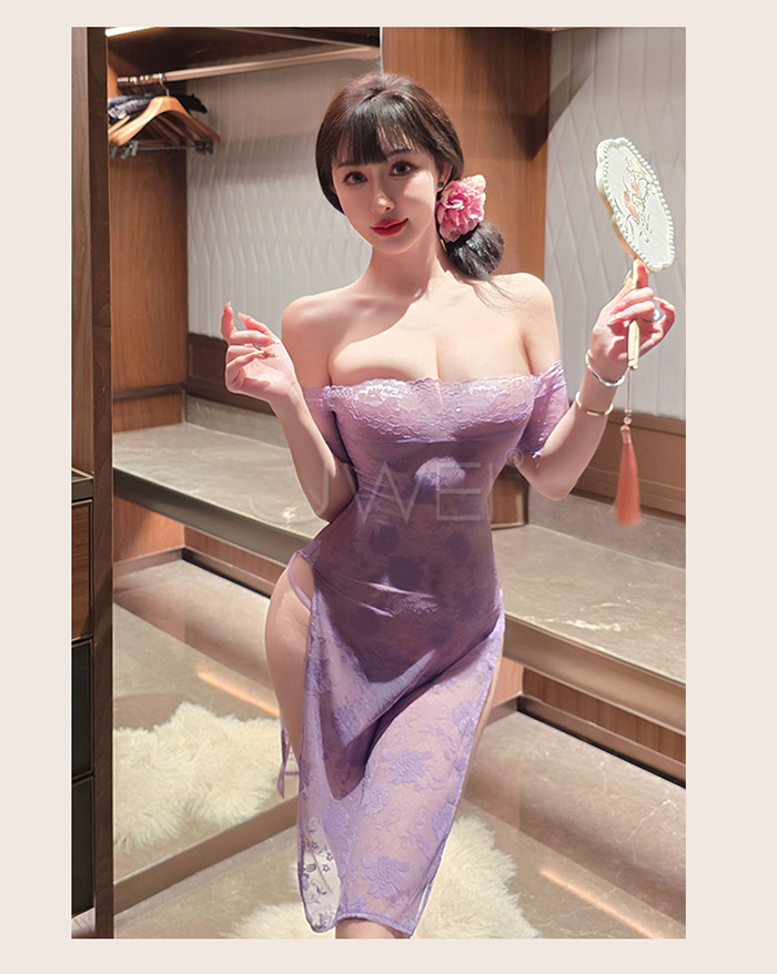 漫野玫瑰.純欲一字肩蕾絲柔美鏤空開衩連身睡衣 【連衣裙+T褲】