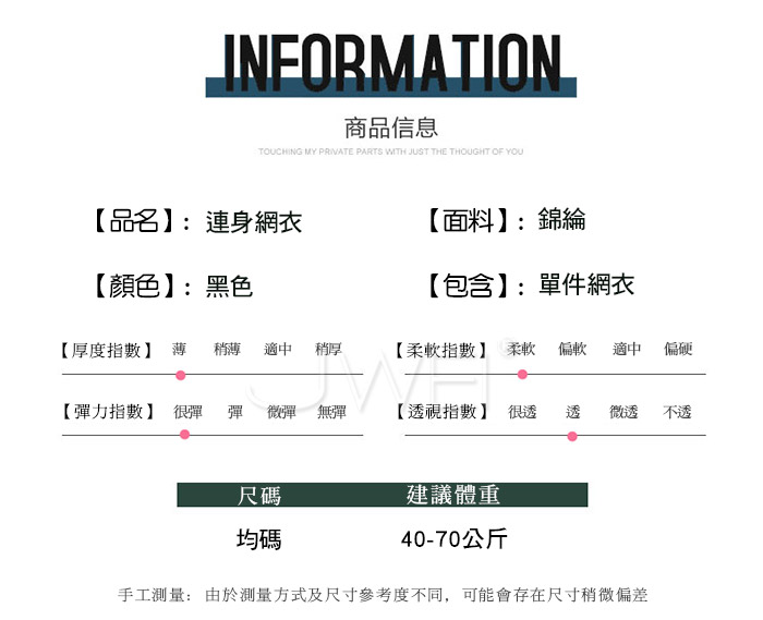 ■內容物:單件網衣 ■適穿尺寸:FREESIZE ■彈性:有 ■未撐開平量尺寸正負誤差1~2cm,1吋=2.54cm ■注意事項:基於保障消費者個人衛生,此貼身衣物恕不接受退換貨。 (如為商品本身暇疵,接受七日內換貨,請勿試穿,謝謝您)