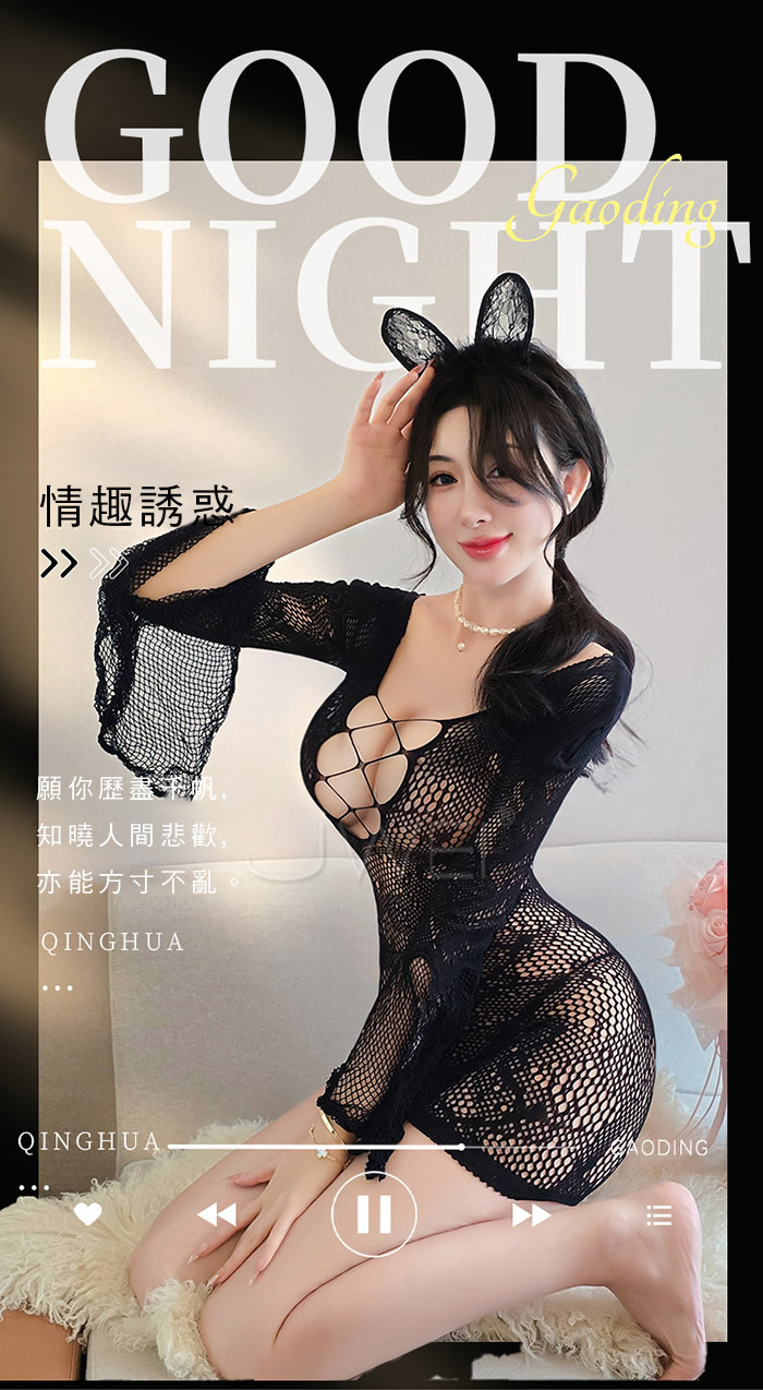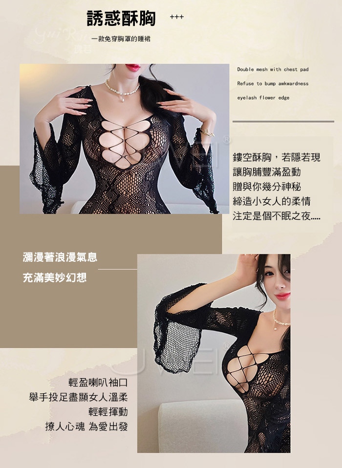 ►您現在的位置:首頁>沐雅春風.鏤空美胸輕盈優雅喇叭袖口包臀網衣
