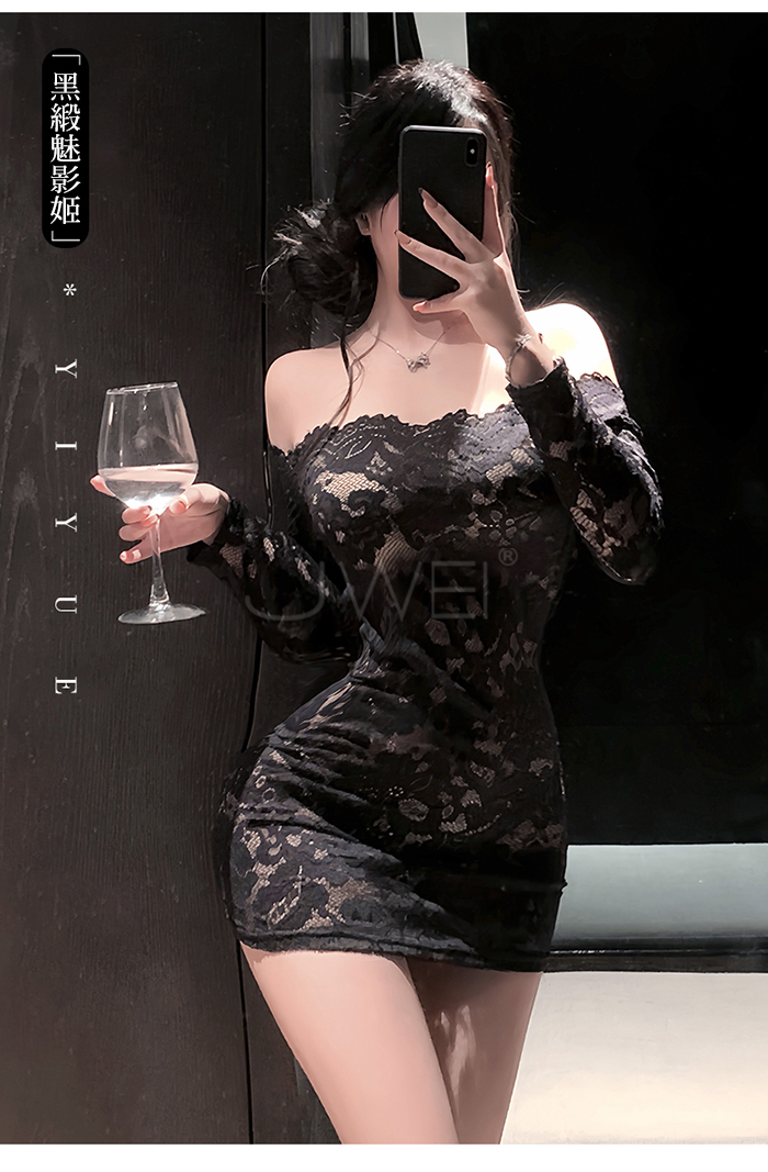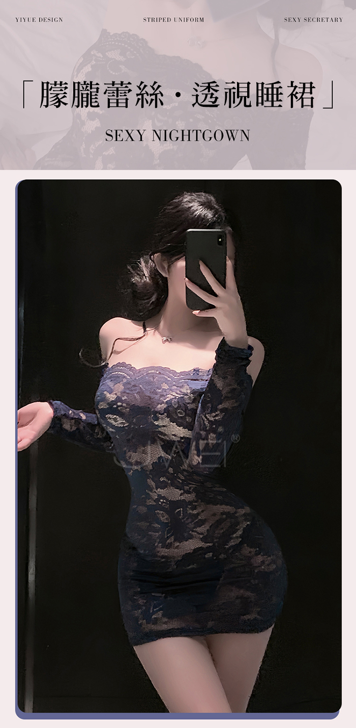 ►您現在的位置:首頁>花蔓朦朧.蕾絲雕花一字領透視包臀睡裙【連身裙+T褲+隱形肩帶-藍色】