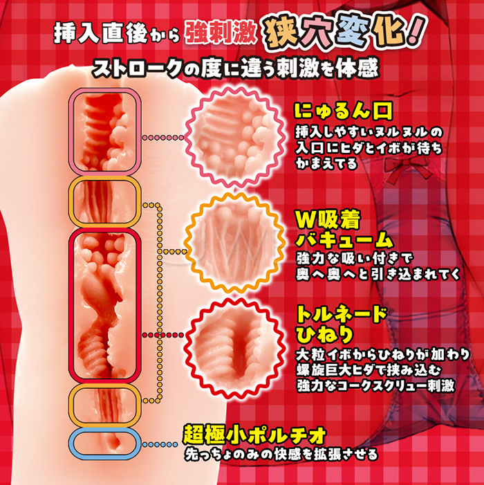 光滑的入口處佈滿褶皺和凸起,W真空吸引強大的吸力讓你不斷被吸入深處,從大顆顆粒到螺旋褶皺肉筋都將你緊緊包覆! 插入時,按壓外觀腰線處的“指壓點”可以進一步增強真空吸力帶來的快感!