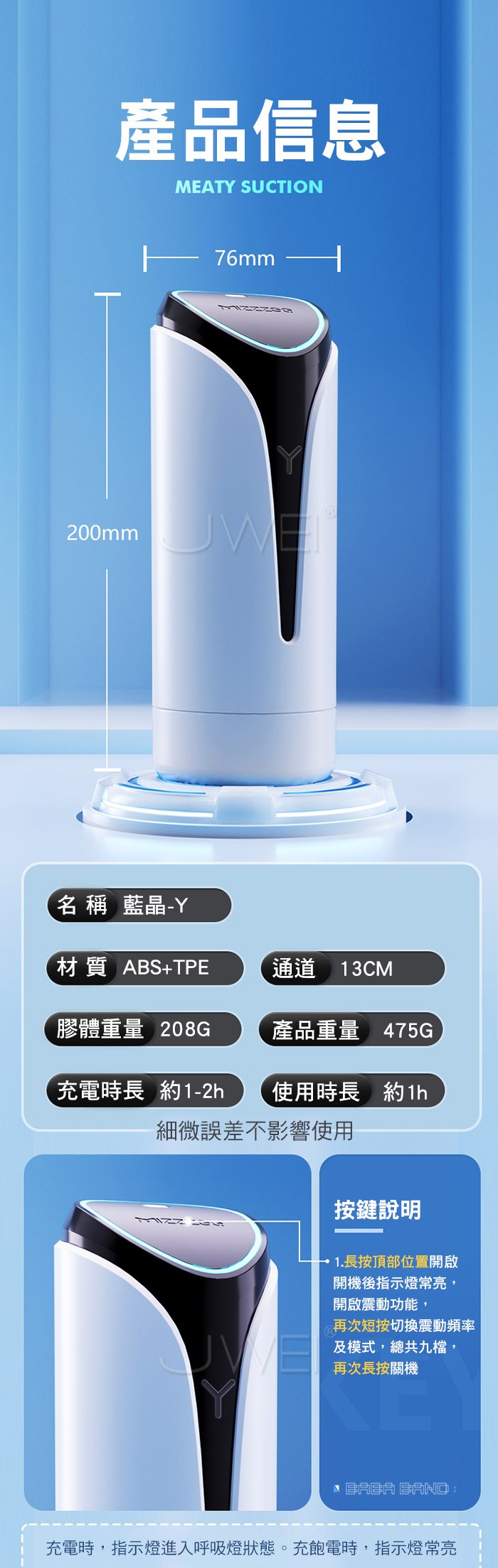 擬真肉感通道,Q彈軟糯,9種模式酥麻震顫 模擬真實通道律動 1指操控 吮吸控制,通過按住前端Y字形出風口 隨著抽插,控制內部氣壓狀態,從緊緻密道,到酣暢淋漓 戰鬥力訓練,層層顆粒刺激,每次多堅持一分鐘,挑戰自我 時尚外觀,流線杯身簡約設計,全新的視覺體驗!! 產品規格 ■尺寸:大小詳如圖片標示 ■材質:TPE+ABS ■特點:9頻震動、Y型氣孔負壓吮吸、APP智控