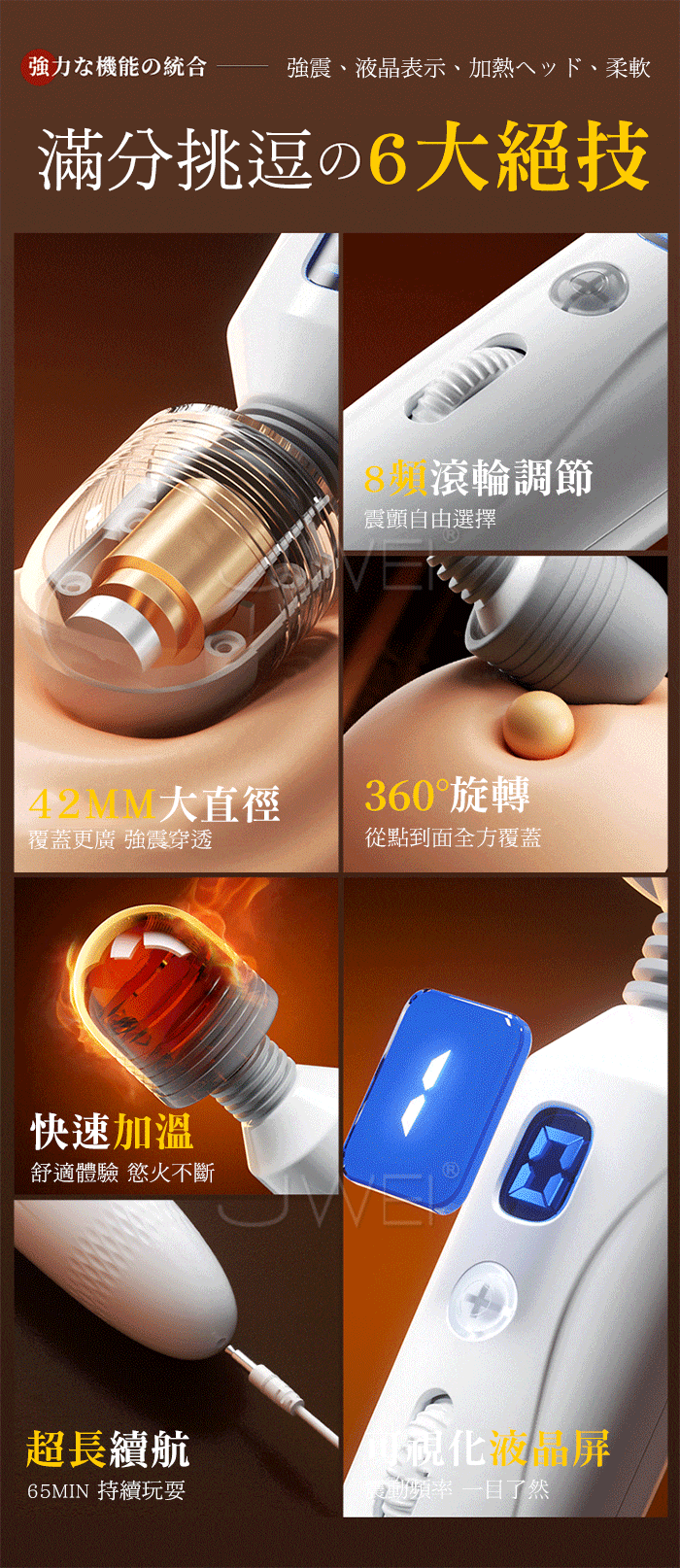 動感強震與肌膚0距離,解釋她的敏感地帶,失控體驗全升級 42mm按摩頭,全方位引爆高潮,充分接觸 盡情震顫 4D立體感震感高頻傳導,8頻變速穿透強震,酥麻感迅速爆發 液晶顯示器,可視化快感衝擊,速度與激情,肉眼可見 產品規格 ■材質: 矽膠+ABS ■規格: 詳如圖片標示 ■功能: 8頻滾輪調節震動、加溫